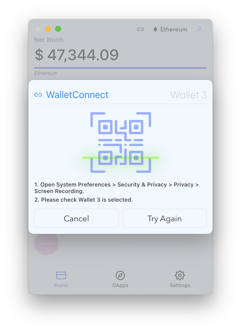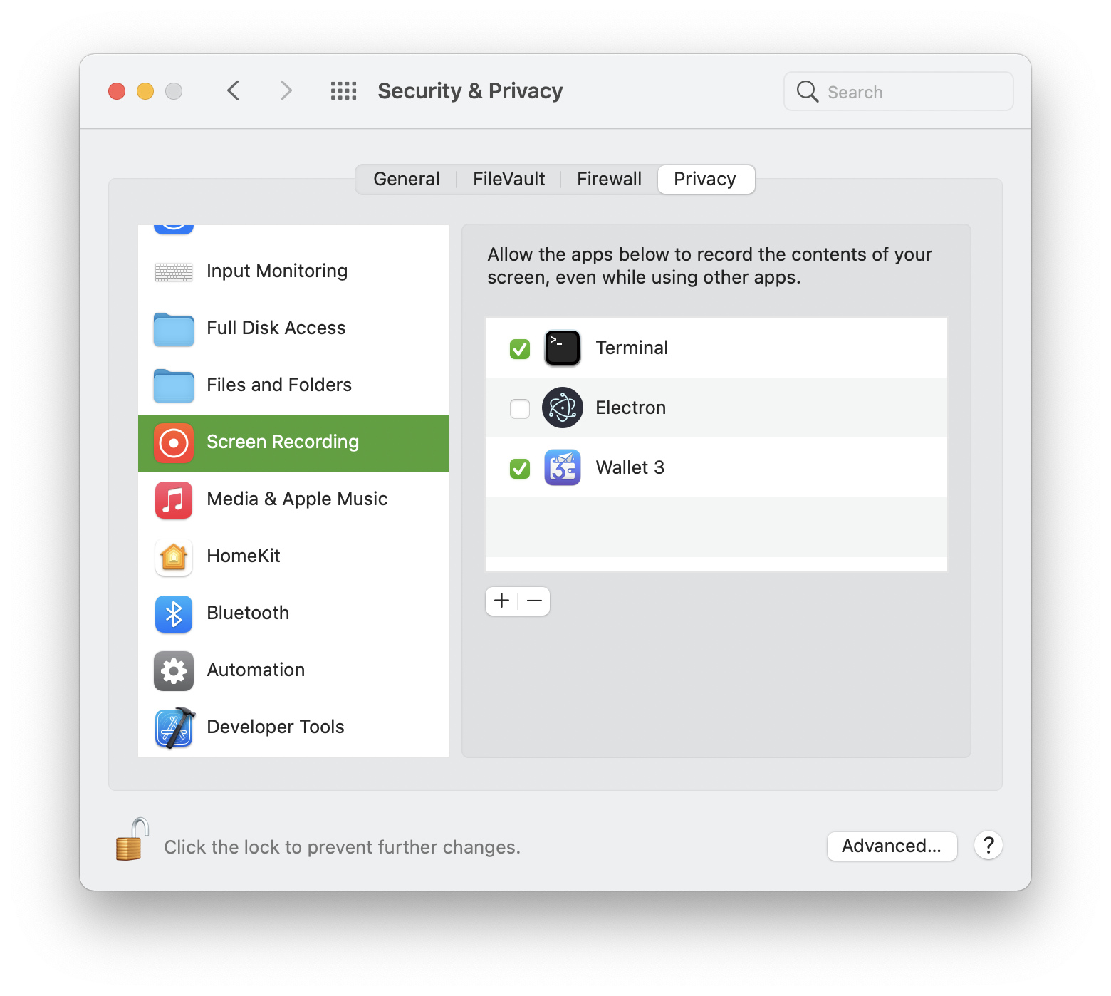 When macOS users use it for the first time, they need to be authorized to scan the screen. Open "System Preferences"-"Security and Privacy"-"Privacy"-"Screen Recording", check Wallet 3, and restart Wallet 3, you will have the permission to access the user's screen. (Windows users do not need additional settings)