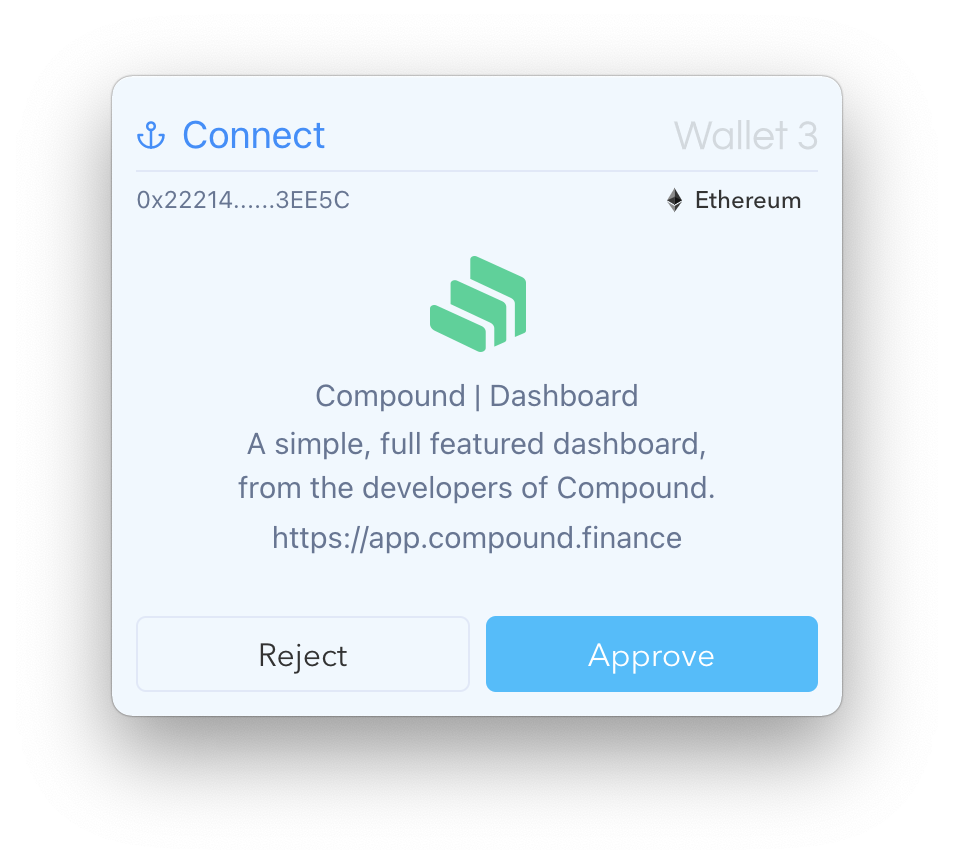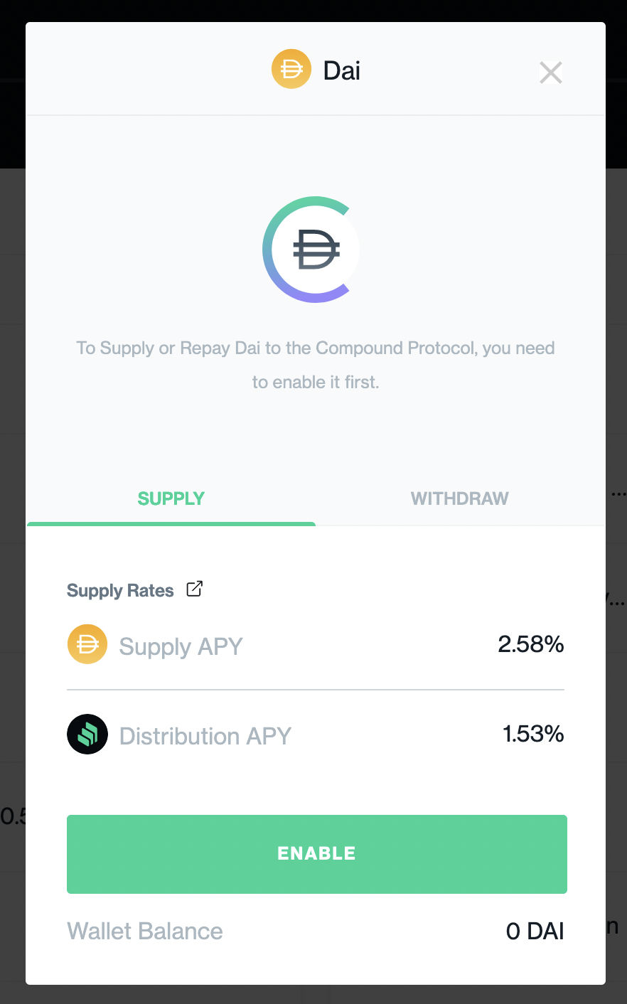 Click "Enable" and the user will be asked to authorize Compound to use Dai. Wallet 3 will also pop up the following dialog box: