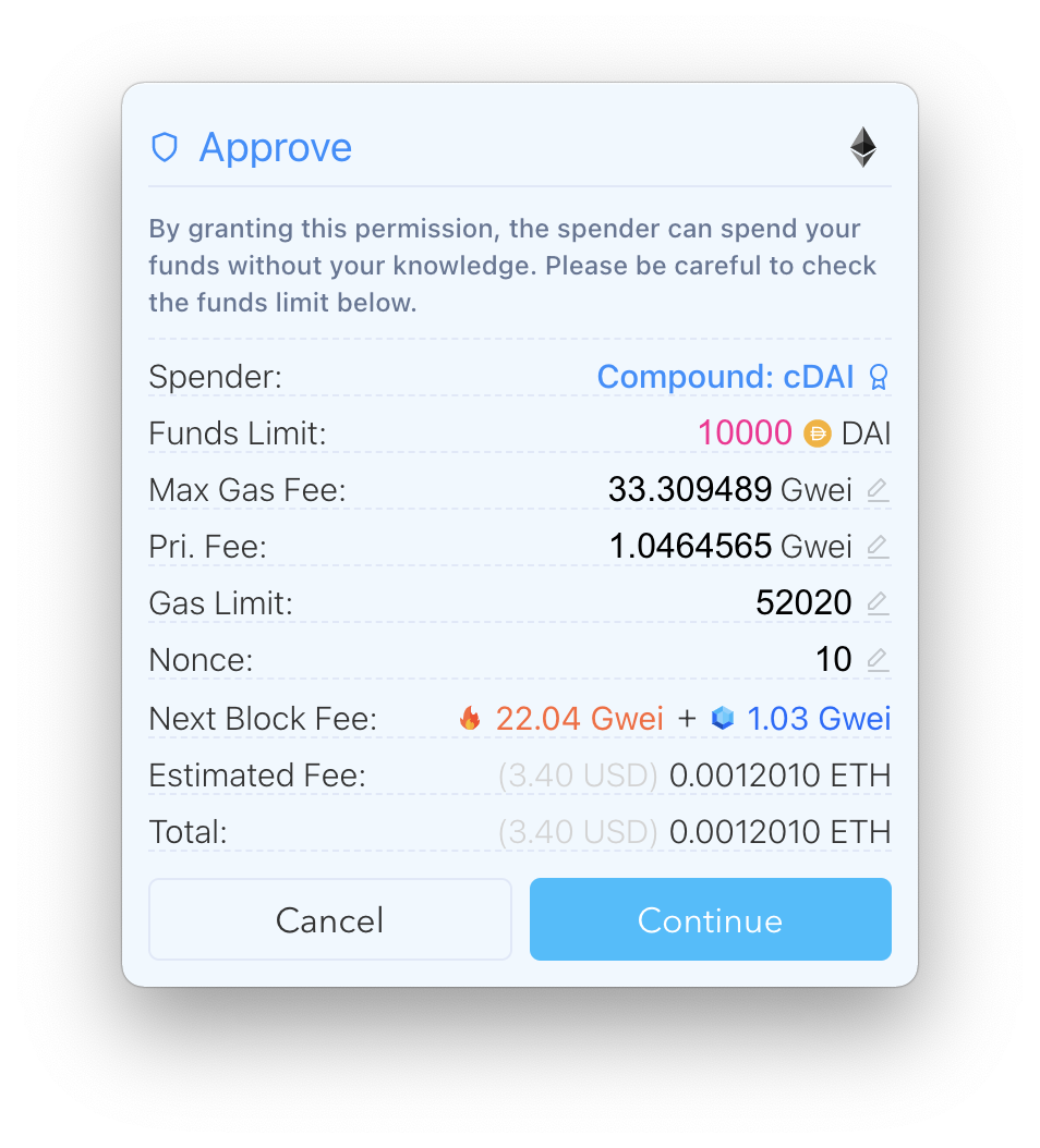 In this way, Compound can only use 10,000 Dai of your assets at most. Compound is an established DeFi application that can stand the test of time, and there is no problem even if it is authorized for unlimited use. Click "Continue", and wait for transaction confirmation after Touch ID authentication. After the transaction is confirmed, Compound can be used for financial management.