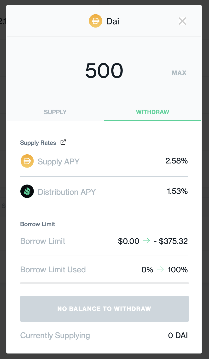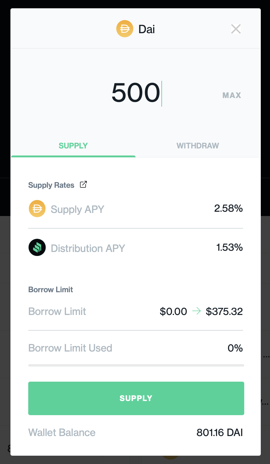 The picture below means that the annualized deposit interest of Dai is 2.58%, and an additional 1.58% annualized COMP token can also be obtained. The COMP token is a decentralized governance token issued by Compound. If you have COMP, you can participate in the decentralized governance of Compound ( no introduction here).